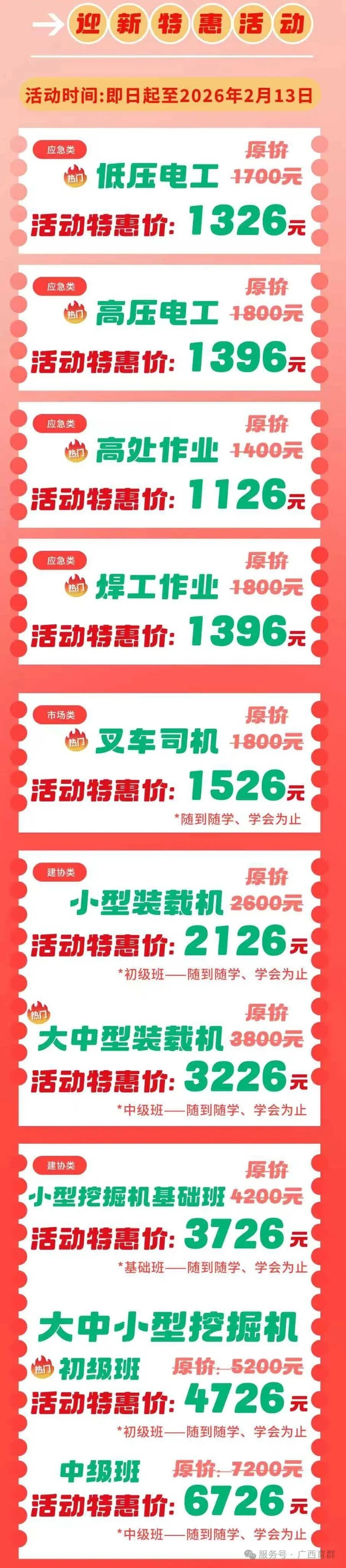 即日起开放2026年1月~3月,高 / 低压电工班、熔化焊接与热切割作业班、高处安装维护拆除作业班报名,考核合格后可取得应急管理部门颁发的全国通用电子版特种作业操作证,助力企业合规用工。