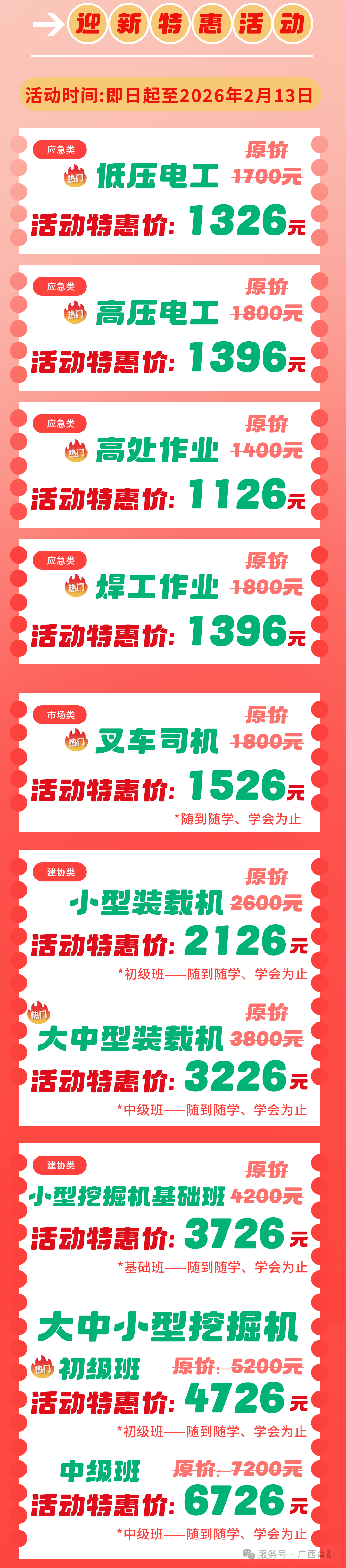 注意啦:以下图片内所提到的工种,只要在活动期(即日起 - 2026 年 2 月 13 日 )提前预约报名,都能直接享受活动价!